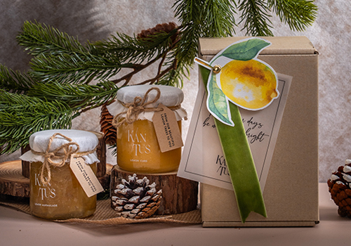 Choose any two of the following: ( Lemon Marmalade 200 g, Lemon Gin Marmalade 200 g, Lemon Lime & Tangerine Marmalade 200 g ) + Pine Cone Candle or Owl Candle 1 piece + Customised Card